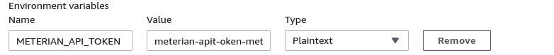 * Click "Additional configuration" at the bottom of the **Environment** section to be able to set environment variables, then set here the METERIAN\_API\_TOKEN variable.