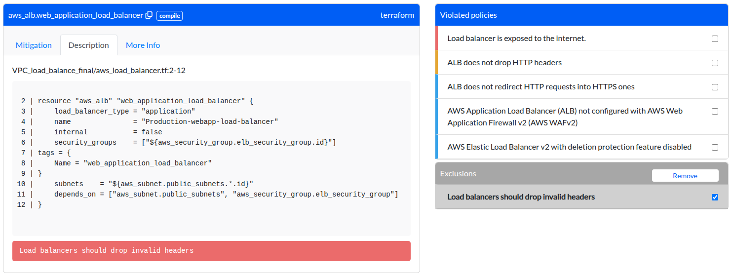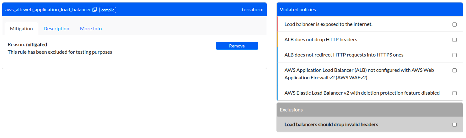 Removing an exclusion will immediately update the report status, and the security violation will once again contribute to your project's overall risk score until the Terraform configuration is updated to comply with the policy.
